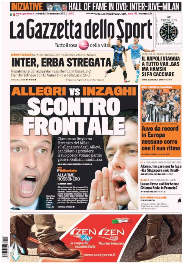 RASSEGNA STAMPA ALLEGRI INZAGHI MILAN – Clamoroso litigio tra il tecnico del Milan e l’allenatore degli allievi, candidato a prendere il suo posto: volano parole grosse. Galliani minimizza. In Europa League nessuna italia cade. Stravince il Napoli, pareggiano Inter, Lazio e Udinese.