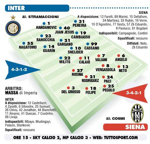 INTER SIENA PROBABILI FORMAZIONI – Dopo il pareggio rimediato in Europa League contro il Rubin Kazan, l’Inter torna a giocare davanti ai propri tifosi. Questo pomeriggio andrà di scena al Meazza la sfida con il Siena. Una gara facile almeno sulla carta, i tre punti permetterebbero ai nerazzurri di scavalcare la Fiorentina e avvicinarsi ai piani alti della classifica. I toscani, probabilmente, si accontenterebbero invece di tornare a casa con un pareggio. Per il match in questione, Andrea Stramaccioni dovrà fare a meno di Mudingayi, Palacio e Stankovic. Nella foto in alto le probabili formazioni secondo il Corriere dello Sport.
