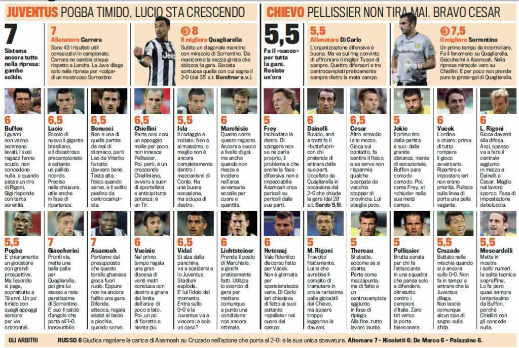 JUVENTUS CHIEVO VOTI E PAGELLE GAZZETTA – Di seguito potete trovare i voti e le pagelle firmati Gazzetta dello Sport della sfida fra la Juventus e il Chievo, gara giocatasi ieri sera allo Juventus Stadium e vinta dalla Vecchia Signora. Dopo Londra altra grande prova di Fabio Quagliarella che realizza due reti e regala i tre punti ai suoi. Bene anche, oramai una sicurezza, Asamoah, mentre malino Pogba, alla prima da titolo al posto di Andrea Pirlo. Da segnalare anche la discesa in campo di Bendtner, per lui però, nessun voto.