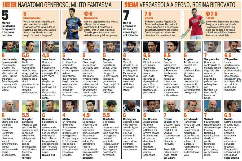 INTER SIENA VOTI PAGELLE GAZZETTA FOTO – L’Inter perde clamorosamente in casa contro il Siena di Cosmi che vince la prima partita in questo campionato. Nerazzurri confusi e senza una precisa idea tattica. Il migliore in campo è stato Ranocchia che nel finale del match è andato addirittura in attacco a cercare il gol del pareggio. Brutta prestazione di Milito, assolutamente inesistente. Da Cassano gli unici lampi di classe in un match abulico. Sneijder continua a litigare con i tifosi. Nel Siena grande prestazione di Pegolo, ancora una volta prodigioso. Ecco i voti e le pagelle della Gazzetta dello Sport.