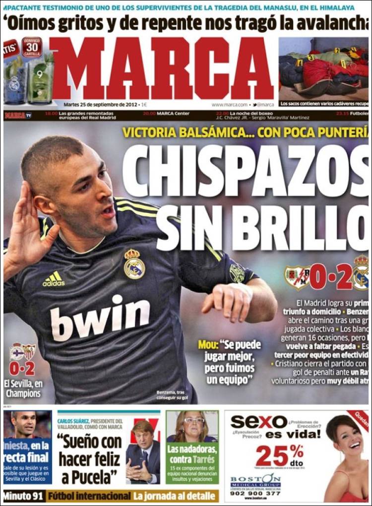 MARCA REAL MADRID – Il Real Madrid vince due a zero contro il Rayo grazie ai gol di Benzema e Ronaldo.