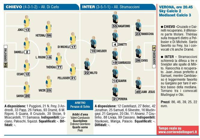 CHIEVO INTER PROBABILI FORMAZIONI STRAMACCIONI DIFESA FOTO – L’Inter di Stramaccioni ha deciso di cambiare contro il Chievo. Il tecnico nerazzurro infatti giocherà per la prima volta con la difesa a tre con Juan Jesus, Ranocchia ai lati e Chivu al centro. Centrocampo a cinque con Alvaro Pereira e Nagatomo, Zanetti, Guarin e Cambiasso centrali e in attacco Sneijder dietro a Milito. I nerazzurri dovranno vincere contro un Chievo che giocherà con il 4-3-1-2 con Pellissier e Di Michele in attacco. L’Inter vuole i tre punti ma il Chievo ha già fatto tremare la Juventus a Torino. Ecco le formazioni della Gazzetta dello Sport.