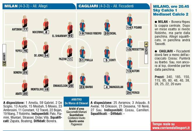 MILAN CAGLIARI DE JONG IBARBO FORMAZIONI – Il Milan di Allegri questa sera dovrà solo vincere. Il club rossonero arriva da due sconfitte consecutive, tre in quattro partite. Il Milan di questa sera ritroverà De Jong in mezzo al campo. Allegri vuole scendere in campo con il 4-3-3 con il tridente offensivo formato da Pazzini centrale, Emanuelson a destra ed El Shaarawy. In panchina ci sarà Tassotti che prenderà il posto di Allegri che è stato squalificato per una giornata dopo le offese all’arbitro nel match contro l’Udinese. Modulo speculare per Ficcadenti con Ibarbo dal primo minuto. Le formazioni della Gazzetta dello Sport.