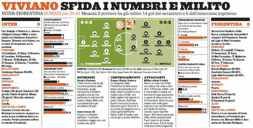 INTER FIORENTINA CASSANO MILITO RONCAGLIA – Domani sera posticipo serale della sesta giornata di campionato tra Inter e Fiorentina. I nerazzurri confermeranno il 3-5-2 con in attacco Cassano-Milito visto anche l’infortunio di Sneijder. Stesso modulo per la Fiorentina di Montella anche se il centrocampo viola è pieno di qualità con Pizarro, Borja Valero, con Cuadrado e Pasqual sugli esterni e Romulo a completare il reparto. In difesa il muro Roncaglia accanto a Rodriguez e Tomovic. L’Inter cercherà di vincere la prima partita in casa in questa stagione. Formazioni della Gazzetta dello Sport.