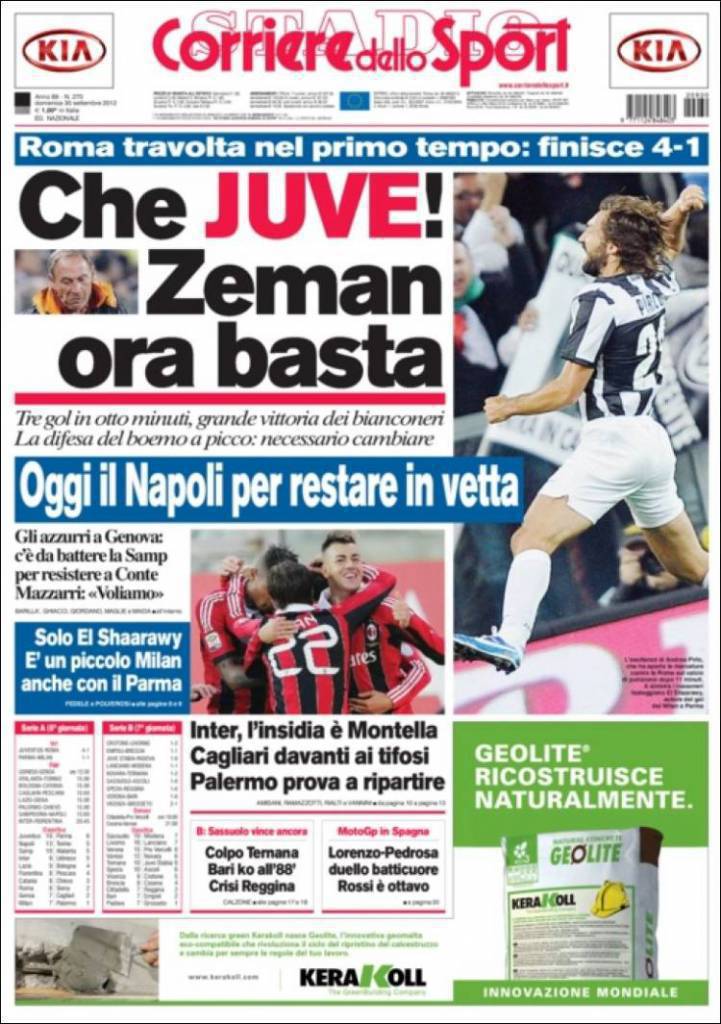 RASSEGNA STAMPA JUVENTUS ROMA ZEMAN – Tre gol in otto minuti e grande prestazione della Juventus di Antonio Conte. Non c’è stata partita ieri sera allo Juventus Stadium con la Roma che sembrava imbabollata. La difesa del boemo cola a picco: è necessario cambiare. E oggi il Napoli cercherà di rispondere ai bianconeri: a Genova dovranno battere la Sampdoria per resistere all’armata di Conte.