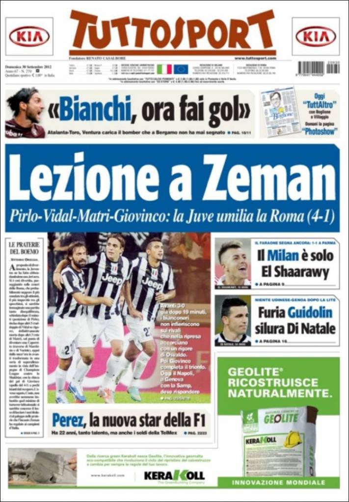 RASSEGNA STAMPA JUVENTUS ROMA ZEMAN – Pirlo, Vidal, Matri, Giovinco. La Juventus umilia la Roma battendola 4-1. Avanti 3-0 dopo soli 19 minuti di gioco. I bianconeri non infieriscono sui rivali che nella ripresa accorciano con un rigore di Osvaldo. Poi Giovinco cala il poker e la partita si chiude.