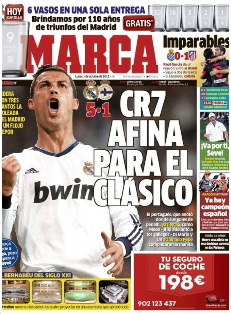 MARCA REAL MADRID – Il Real Madrid vince cinque a uno contro il Deportivo. Tripletta di Ronaldo, già pronto per il Clasico.