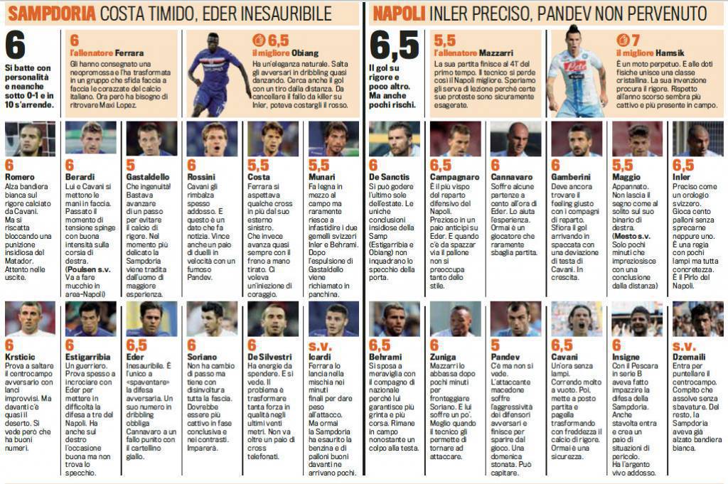 SAMPDORIA NAPOLI VOTI PAGELLE GAZZETTA – Di seguito potete trovare i voti e le pagelle Gazzetta dello Sport di Sampdoria-Napoli, partita andata in scena ieri pomeriggio allo stadio Marassi e conclusasi con il risultato di 1 a 0 in favore degli ospiti partenopei. In gol, tanto per cambiare, il solito Cavani, che ha trasformato un calcio di rigore. Il migliore del match risulta essere però il talentuoso Marek Hamsik, all’ennesima grande prestazione stagionale. Fra le fila blucerchiate nuova prova convincente del talentuoso spagnolo Obiang.