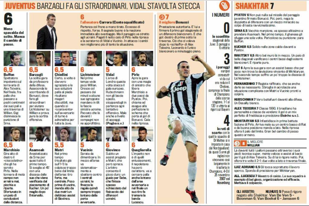 JUVENTUS SHAKHTAR DONETSK VOTI PAGELLE GAZZETTA – Di seguito potete trovare i voti e le pagelle firmati Gazzetta dello Sport della sfida giocatasi ieri sera allo Juventus Stadium di Torino fra i padroni di casa bianconeri e gli ucraini dello Shakhtar Donetsk di Lucescu. Il match si è concluso con il risultato di parità 1 a 1. Il migliore in campo è stato Bonucci (voto 7), che realizzato la rete del pareggio bianconero seppur protagonista in negativo nella rete degli ucraini. Malino invece l’attacco, tutti sottotono. Per Pirlo infine una prestazione opaca, da 6 in pagella.