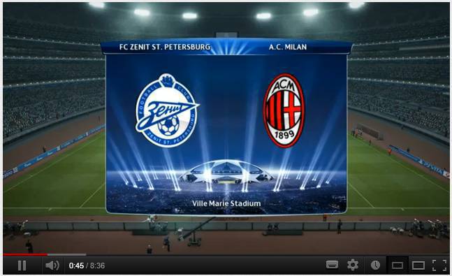 CHAMPIONS LEAGUE ZENIT SAN PIETROBURGO PES 2013 / In programma questa sera alle 18:00 (ora italiana), la sfida di Champions League tra lo Zenit San Pietroburgo di Spalletti ed i rossoneri in cerca di riscatto dopo le deludenti prestazioni che hanno influenzato quest’inizio di stagione. Noi della redazione di Calciomercatonews vogliamo proporvi l’interessante match sotto un altro punto di vista: una simulazione a Pro Evolution Soccer 2013, gioco uscito il 20 Settembre per Playstation 3 ed Xbox 360. Di seguito il video, non ci resta che augurarvi una buona visione!