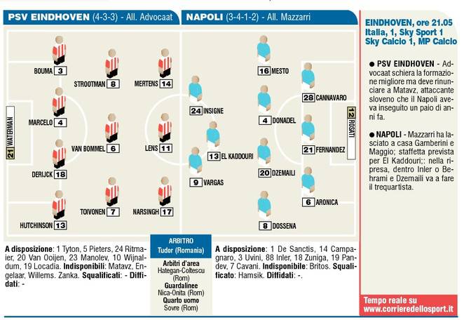 PSV NAPOLI PROBABILI FORMAZIONI VAN BOMMEL INSIGNE VARGAS – Questa sera il Napoli di Mazzarri giocherà in casa del Psv e cercherà di vincere la seconda partita consecutiva del girone di Europa League. I partenopei dovranno vedersela contro Van Bommel e soci. Il Psv si basa molto sulla personalità dell’ex Milan, con lui a centrocampo anche uno dei gioielli del club, Kevin Strootman. Nel Napoli invece attacco giovane con El Kaddouri dietro le due punte Vargas e Insigne. Vargas spera di ripetere l’exploit della prima giornata di Europa League in cui segnò una tripletta. Ecco le probabili formazioni del Corriere dello Sport.