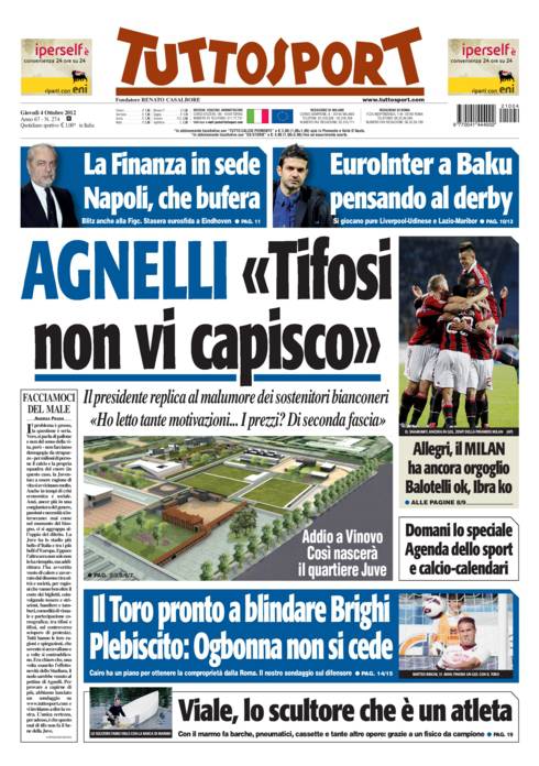 TUTTOSPORT AGNELLI – Su Tuttosport si parla della polemica tra Agnelli e i tifosi per il prezzo dei biglietti.