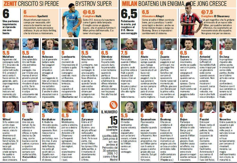 ZENIT MILAN VOTI PAGELLE GAZZETTA – Di seguito potete visionare i voti e le pagelle relativi alla sfida fra il Milan e lo Zenit di San Pietroburgo firmati Gazzetta dello Sport. Il match, andato in scena ieri sera alle ore 18.00 in Russia si è concluso con il risultato di 3 a 2 in favore dei rossoneri. Ennesima grande prestazione di El Shaarawy, ancora una volta il migliore in campo, ma anche grandiosa prova di Chiristian Abbiati che ha sventato almeno in 3 occasioni il gol degli avversari.