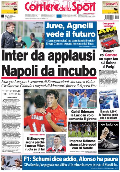 CORRIERE INTER NAPOLI – Sul Corriere dello Sport si parla anche del Napoli che perde tre a zero in casa del Psv.