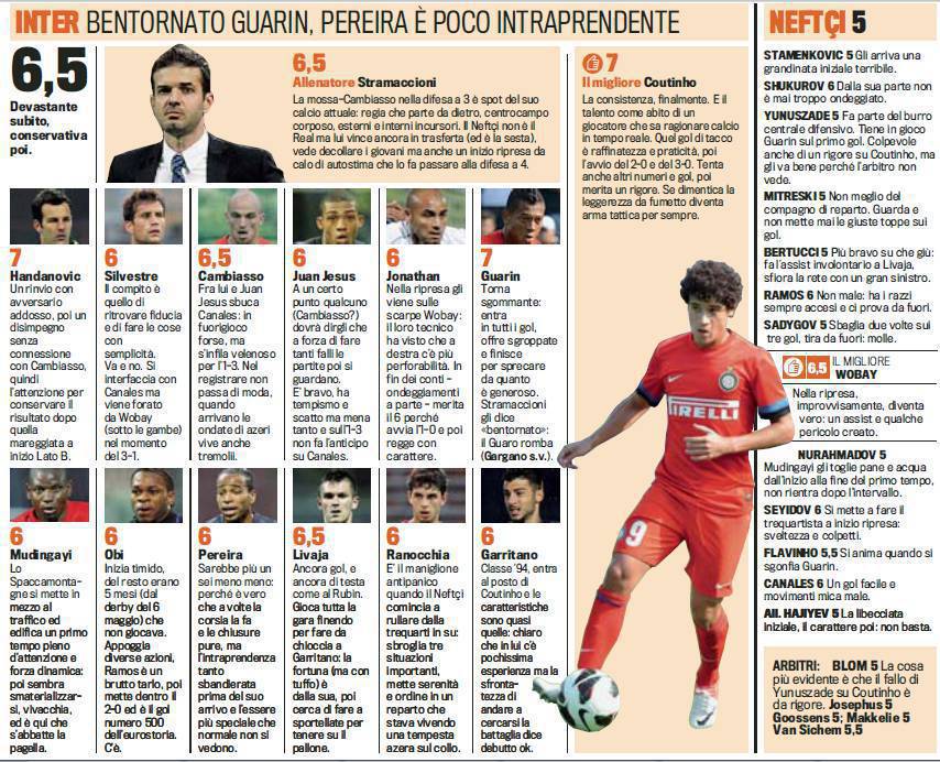 NEFTCI INTER VOTI PAGELLE GAZZETTA – Di seguito potete visionare i voti e le pagelle Gazzetta dello Sport di Neftci-Inter, sfida valevole per il secondo turno di Europa League e giocatasi ieri sera. Il match si è concluso con il risultato di 3 a 1 in favore dei nerazzurri. La sfida si chiude praticamente nel primo tempo grazie anche alle magie di Coutinho che oltre ad uno splendido gol di tacco realizza grandi giocate e si rende spesso pericoloso. Molto bene anche Guarin, sempre nel vivo dell’azione, così come Handanovic, ormai una sicurezza.