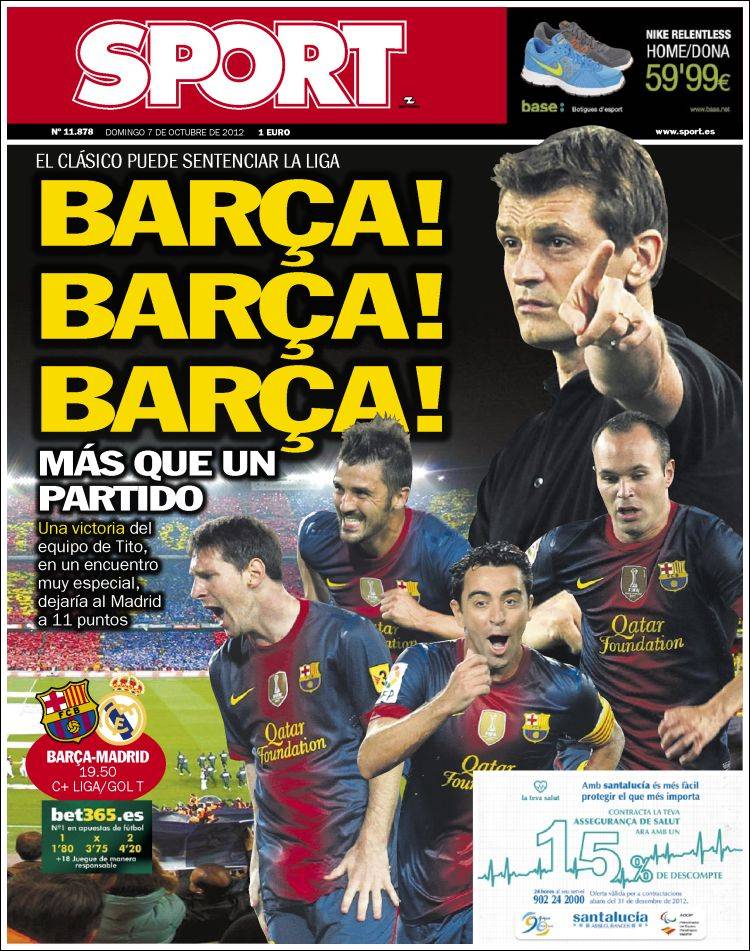 RASSEGNA STAMPA SPORT – Appuntamento alle 19.50 per tutti i tifosi spagnoli e gli appassionati della Liga. Al Camp Nou, scenderanno in campo i padroni di casa del Barcellona e il Real Madrid. Gli uomini di Tito Vilanova hanno la grande occasione di allontanare (definitivamente?) il Real; se i blaugrana riuscissero a portare a casa i tre punti, andrebbero addirittura a +11 in classifica sugli acerrimi rivali. Il quotidiano iberico Sport dedica la copertina al Clásico.
