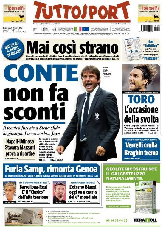 RASSEGNA STAMPA TUTTOSPORT – La Juventus torna in campo e il quotidiano torinese Tuttosport gli dedica la copertina di oggi. In particolare la dedica ad Antonio Conte, che sarebbe tutt’altro che contento dopo il pareggio casalingo della sua squadra contro lo Shakhtar Donetsk. Oggi pomeriggio i bianconeri saranno di scena a Siena, Conte non vuole altro che i tre punti e una prestazione all’altezza della Juve.