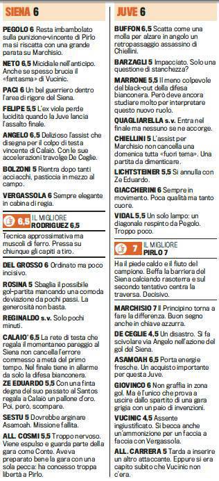 SIENA JUVENTUS VOTI PAGELLE GAZZETTA – Poco più in basso potete visionare i voti e le pagelle firmati Gazzetta dello Sport relativi alla sfida fra la Juventus e il Siena, gara giocatasi ieri pomeriggio allo stadio Artemio Franchi di Siena e conclusasi con il risultato di 2 a 1 in favore dei campioni d’Italia in carica. Le reti, siglate da Pirlo e Marchisio, due fra i migliori in campo. Bene anche il solito Calaiò, oramai sempre più bomber di questo Siena. Godetevi i voti poco più in basso.