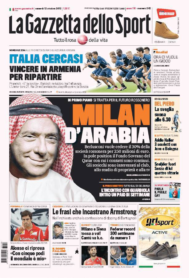 RASSEGNA STAMPA MILAN BERLUSCONI – Silvio Berlusconi vuole cedere il 30% della società rossonera per 250 milioni di euro. In pole positione il Fondo Sovrano del Qatar con cui i contatti sono continui. Gli sceicchi sono interessati al club, allo stadio di proprietà e alla tv. L’incontro con Guardiola entro un paio di settimane. Italia cercasi: vincere in Armenia per ripartire. Balotelli in dubbio, ha l’influenza.