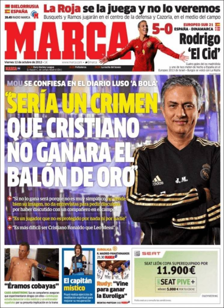 RASSEGNA STAMPA MOURINHO CRISTIANO RONALDO – Josè Mourinho si confessa: Se Cristiano Ronaldo non vincesse il Pallone D’Oro sarebbe un crimine. “Se non lo vince sarà perchè non è molto simpatico. Non rilascia interviste per chiedere scusa se ha un contrasto con un compagno in campo. E’ un giocatore che non è protetto da nulla e da nessuno. E’ più difficile essere Cristiano Ronaldo che Leo Messi”.