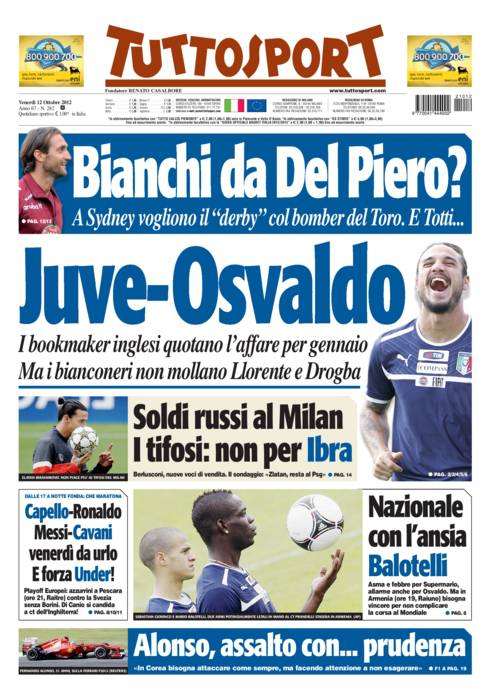 RASSEGNA STAMPA JUVENTUS OSVALDO – I bookmaker inglesi quotano Osvaldo alla Juventus già a aprtire da gennaio ma i bianconeri non mollano Llorente e Drogba. Soldi russi al Milan. I tifosi rossoneri non vogliono il ritono di Ibrahimovic e lo invitano a restare al Psg. Nazionale con l’ansia Balotelli: influenzato, se non dovesse recuperare sarà sostituito da Giovinco.