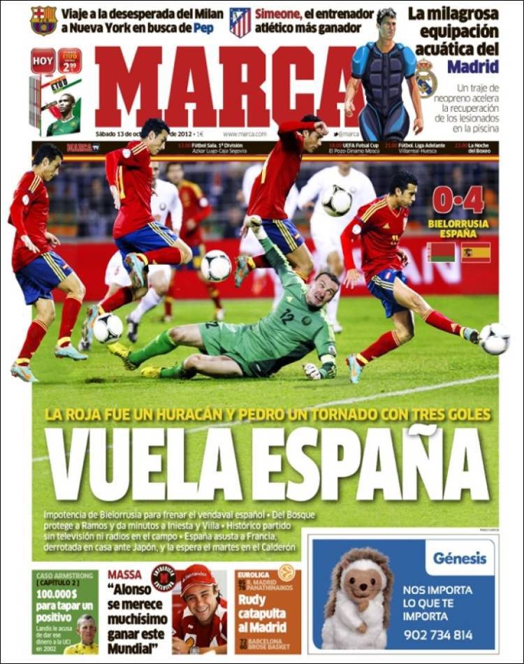 MARCA SPAGNA – Sul quotidiano Marca si parla della Spagna che vince quattro a zero contro la Bielorussia con tre gol di Pedro.