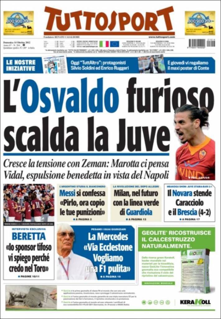 RASSEGNA STAMPA OSVALDO JUVENTUS – Cresce la tensione tra Zeman e Osvaldo: Marotta ci pensa. Vidal, espulsione benedetta in vista del Napoli. Messi si confessa: “Pirlo, ora copio le tue punizioni“. Milan, nel futuro con la linea verde di Guardiola.