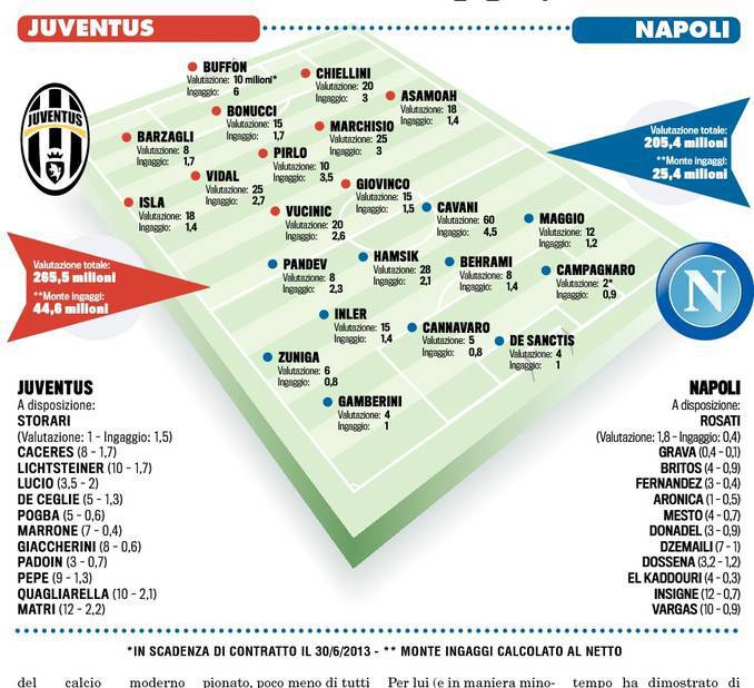 JUVENTUS NAPOLI SFIDA CAMPO – Sabato è prevista la grande sfida tra Juventus e Napoli, attualmente regine del campionato dopo le prime otto giornate. I due club italiani vogliono assolutamente puntare alla conquista del Tricolore e sabato si sfideranno per capire anche la loro forza all’interno del campionato italiano. Il quotidiano torinese Tuttosport ha deciso di pubblicare una foto in cui si parla delle valutazioni dei giocatori con il relativo ingaggio. I 22 che dovrebbero scendere in campo costerebbero in totale 226 milioni di euro, con un monte ingaggi da 48,6 milioni di euro. Ovviamente Cavani è il più costoso con circa 60 milioni di euro. Ecco la foto.
