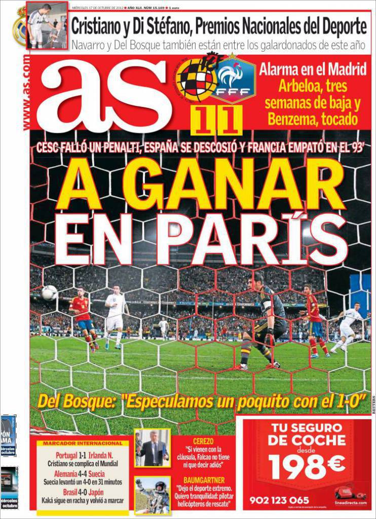 AS SPAGNA – Sul quotidiano As si parla della Spagna che pareggia in casa per uno a uno contro la Francia.