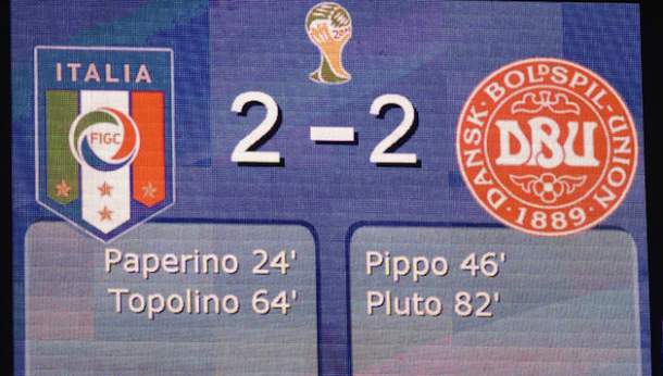 ITALIA DANIMARCA TABELLONE DISNEYLAND SAN SIRO FOTO – Solo 24 ore fa, arrivati allo stadio Giuseppe Meazza in San Siro per assistere ad Italia-Danimarca, i tifosi, hanno trovato il tabellone luminoso già completato e sorpresa delle sorprese, il match pareva essersi già giocato. 2-2 il punteggio finale con reti però di alcuni personaggi Disney: per l’Italia Paperino e Topolino i marcatori, per gli scandinavi Pippo e Pluto. Ovviamente erano soltanto alcune prove tecniche per testare l’efficienza del tabellone, ma certo che per un attimo, il timore che i personaggi di Disneyland avessero già disputato il match, c’è stato. Per dovere di cronaca, il match si è concluso con un netto 3-1 ed il tabellone luminoso ha segnato correttamente i marcatori: Montolivo, De Rossi, Balotelli e Kvist…