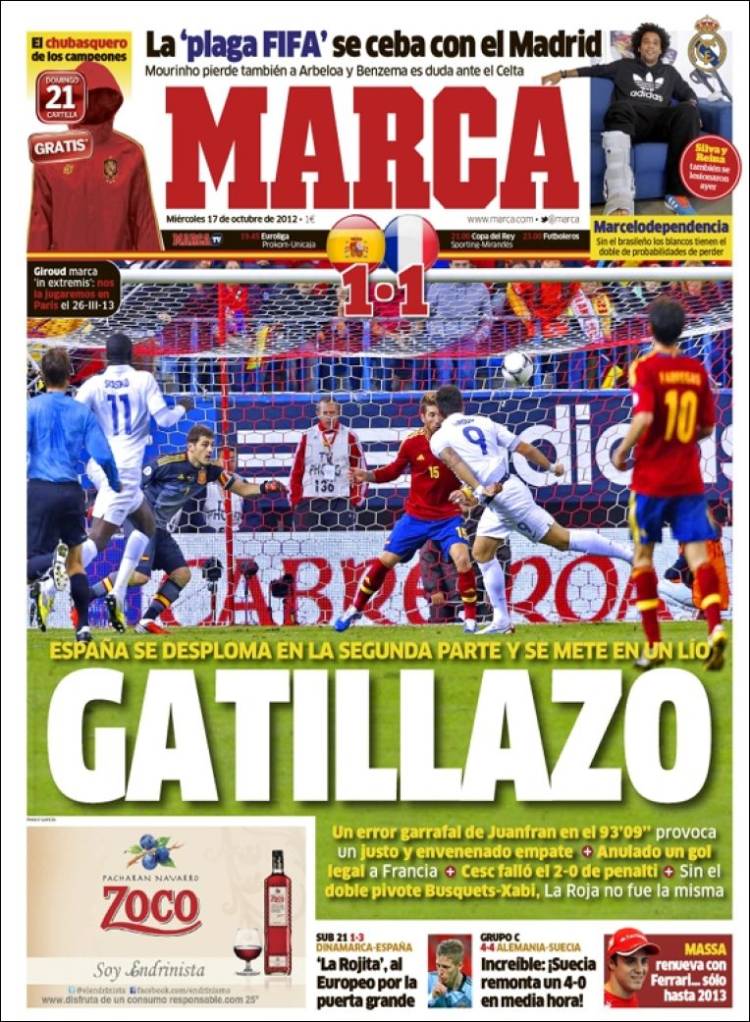 MARCA SPAGNA – Sul quotidiano spagnolo Marca si parla del pareggio per uno a uno tra Spagna e Francia.
