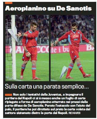 Altro caso, quello dell’aeroplanino di carta lanciato contro De Sanctis. Durante il corso del match, i tifosi bianconeri si sarebbero impegnati a distrarre l’estremo difensore napoletano, che, impassibile, avrebbe presto l’oggetto di carte sistemandolo alle spalle della porta. Di seguito la foto.