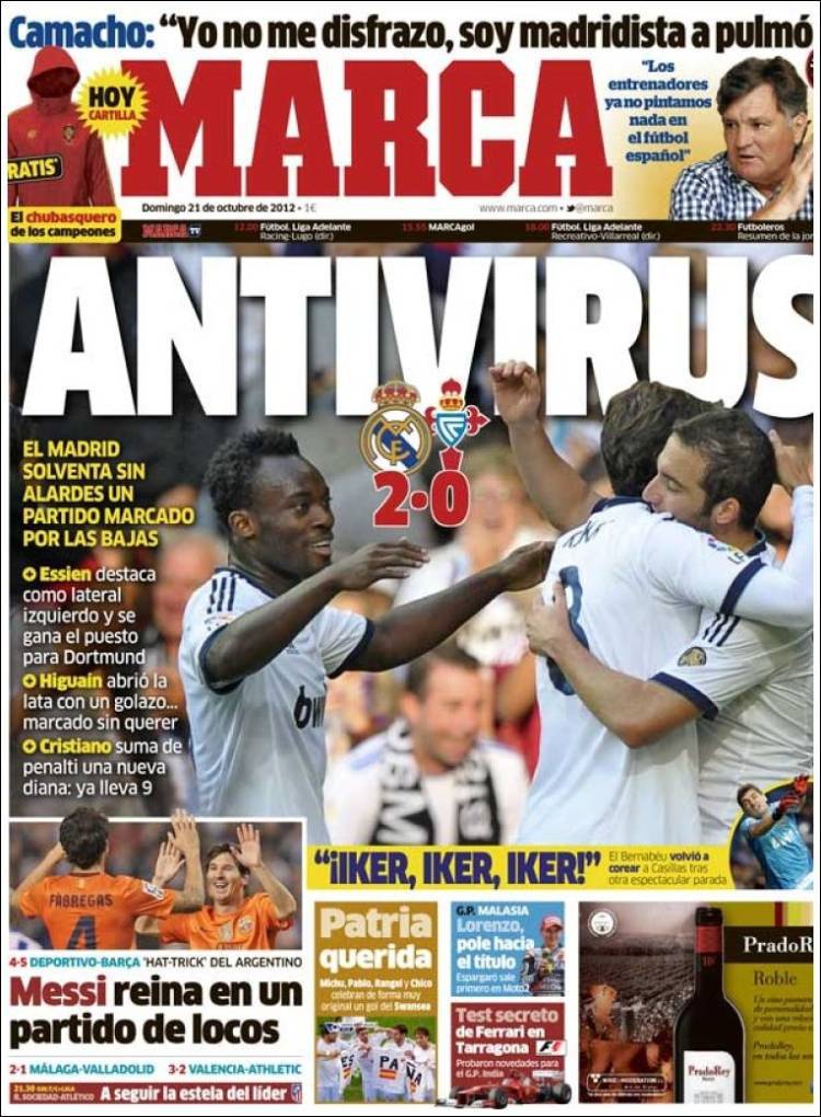 RASSEGNA STAMPA REAL MADRID – Il Real Madrid batte senza fatica il Celta de Vigo per 2-0 con gol di Higuain e Cristiano Ronaldo. Higuain segna la rete del vantaggio dopo appena dieci minuti. Non succede quasi nulla fino al calcio di rigore trasformato da Ronaldo.