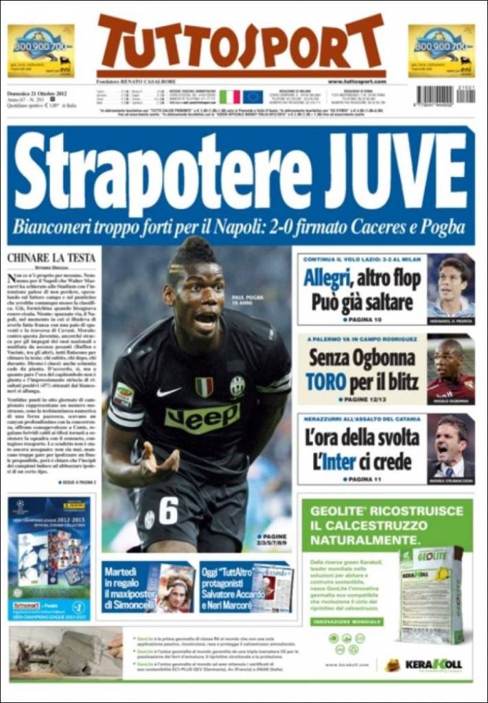 RASSEGNA STAMPA JUVENTUS NAPOLI – Bianconeri troppo forti per il Napoli: 2-0 firmato Caceres e Pogba. Allegri, altro flop: può già saltare. L’ora della svolta, l’Inter ci crede.
