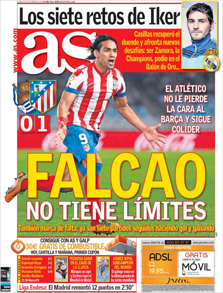 AS FALCAO – Una rete di Falcao all’ultimo minuto permette all’Atletico Madrid di vincere contro la Real Sociedad e di agguantare il Barcellona in testa.