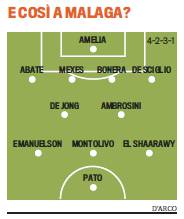 MALAGA MILAN PROBABILI FORMAZIONI – Probabili interessanti novità in casa Milan in vista della trasferta di Malaga di domani sera, gara valevole per il terzo turno dei Gironi di Champions League. Allegri sembra intenzionato a rispolverare il suo 4-2-3-1 con Montolivo sulla trequarti così come schierato da Prandelli nella Nazionale. In attacco potrebbe partire Pato dal primo minuto, ormai pienamente recuperato, mentre in cabina di regia, al fianco di De Jong, dovrebbe stazionare Ambrosini. Bocciato Boateng così come Nocerino. Ancora in dubbio, infine, la presenza di Abbiati.