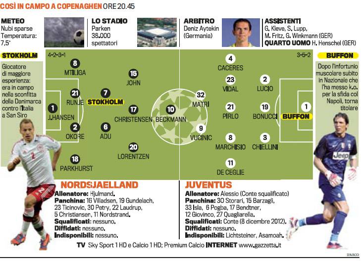 NORDSJAELLAND-JUVENTUS PROBABILI FORMAZIONI – Di seguito potrete visionare le probabili formazioni firmate Gazzetta dello Sport della sfida fra i danesi del Nordsjaelland e la Juventus, gara in programma questa sera in Danimarca alle ore 20.45 e valevole per il terzo turno dei Gironi di Champions League. In casa bianconera torna dopo l’infortunio Gigi Buffon, che torna ad occupare il proprio posto fra i pali. Novità in difesa con la partenza dal primo minuto di Lucio al posto di Barzagli. A centrocampo dovrebbero giocare sugli esterni Caceres e Vidal mentre il duo d’attacco favorito sembrerebbe essere quello formato da Vucinic e Matri.
