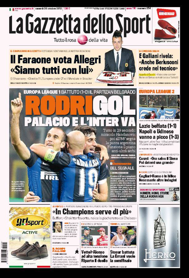 GAZZETTA PALACIO INTER – Sulla Gazzetta dello Sport si parla di Rodrigo Palacio, attaccante dell’Inter, che ieri ha segnato l’uno a zero contro il Partizan.