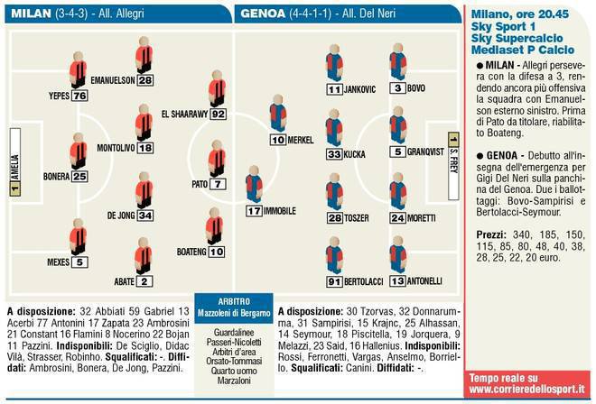MILAN GENOA PROBABILI FORMAZIONI – Questa sera il Milan di Allegri affronterà il Genoa del nuovo tecnico Gigi Delneri che ritorna in Serie A dopo la parentesi negativa con la Juventus. Nel Milan ci sarà ancora una volta la difesa a tre già vista contro il Malaga. I tre centrali saranno Yepes-Bonera-Mexes, a centrocampo spazio a De Jong e Montolivo in cabina di regia con Emanuelson a sinistra e Abate a destra. Attacco a tre punte con Boateng spostato a destra, Pato centrale ed El Shaarawy a sinistra. Nel Genoa classico modulo di Delneri, 4-4-2 con Merkel dietro a Immobile. Le formazioni del Corriere dello Sport.