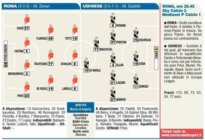 ROMA UDINESE PROBABILI FORMAZIONI – Roma-Udinese è il posticipo della nona giornata di Serie A, in programma questa sera alle 20.45 allo stadio Olimpico. Zeman recupera Destro e Totti in extremisma deve rinunciare a Balzaretti, out per 15 giorni. Prima convocazione per il brasiliano Dodò. Il boemo schiererà la Roma con il solito 4-3-3 con Stekelenburg tra i pali, Dodò, Castan, Marquinhos e Piris in difesa, De Rossi, Tachtsidis e Florenzi a centrocampo; in attacco il trio delle meraviglia con Lamela, Osvaldo e Totti. Guidolin, invece, si affida al 3-5-1-1 con Brkic tra i pali, Heurtaux, Coda e Domizzi in difesa; Faraoni, Pereyra, Allan, Lazzari e Armero a centrocampo; in attacco Maicosuel a fare da supporto all’unica punta, Di Natale.