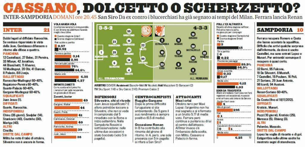 INTER SAMPDORIA PROBABILI FORMAZIONI – Di seguito potete visionare le probabili formazioni di Inter-Sampdoria, firmate Gazzetta dello Sport. Il match si terrà domani sera allo stadio San Siro e sarà valevole per il decimo turno di Serie A, turno naturalmente infrasettimanale. I nerazzurri tornano in campo dopo la grande vittoria di Bologna di domenica pomeriggio. Stramaccioni starebbe pensando al classico 3-5-2 con la coppia Cassano-Milito in attacco. In difesa spazio dal primo minuto a Silvestre che potrebbe prendere il posto di Ranocchia (per lui un turno di riposo).