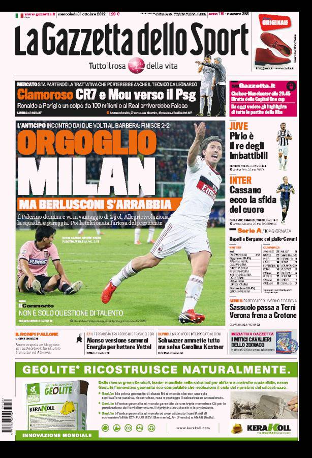 GAZZETTA MILAN – Sulla Gazzetta dello Sport si parla del Milan che pareggia due a due a Palermo ma Berlusconi è furioso.