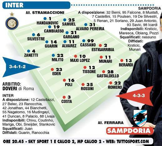 INTER SAMPDORIA PROBABILI FORMAZIONI – Di seguito potete visionare le probabili formazioni di Inter-Sampdoria, sfida che si giocherà questa sera allo stadio San Siro valevole per il decimo turno di Serie A (turno infrasettimanale). Mister Andrea Stramaccioni potrebbe fare riposare Andrea Ranocchia, diffidato, in vista della super-sfida contro la Juventus del weekend. Al suo posto sembra destinato ad una maglia da titolare Matias Silvestre, fino ad oggi acquisto molto criticato da parte degli addetti ai lavori. In attacco dovrebbero partire dal primo minuto Milito e Cassano anche se Palacio scalpita.