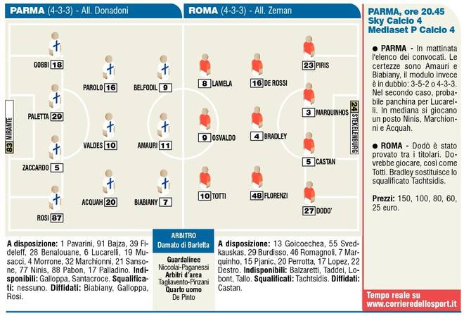 PARMA ROMA PROBABILI FORMAZIONI – Il Parma questa sera al Tardini vorrà vincere contro la Roma di Zeman che deve riscattare la sconfitta casalinga maturata domenica scorsa contro l’Udinese. Zeman non cambia la Roma, niente turnover, in campo ci vanno Osvaldo come attaccante centrale supportato da Lamela e Totti. Ancora panchina per Destro. A centrocampo il regista sarà Bradley al posto dello squalificato Tachtsidis. Accanto a lui De Rossi e Florenzi. Il Parma giocherà con un modulo simile, 4-3-3 con Amauri punta supportato da Belfodil e Biabiany. Ecco le probabili del Corriere dello Sport.