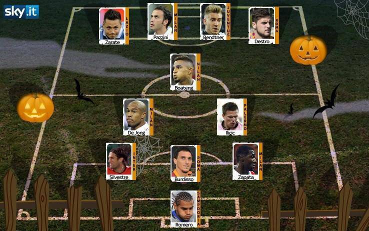 TOP 11 HALLOWEEN – In occasione della festa di Halloween di ieri sera, è stata stilata una TOP 11 horror, composta da quei giocatori che hanno deluso le attese in queste prime 10 uscite stagionali. Molti i rossoneri presenti come Pazzini,Boateng, De Jong e Zapata. Non mancano juventini, interisti e romanisti, come ad esempio Bendtner, Silvestre, Destro, Burdisso. In porta ci va l’estremo difensore della Sampdoria, Romero, e a completare l’11 Mauro Zarate della Lazio e Ilicic del Palermo.