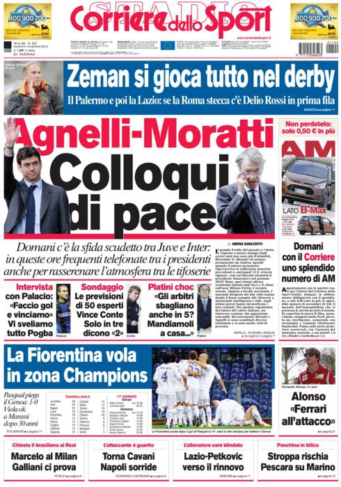 CORRIERE AGNELLI MORATTI – Sul Corriere dello Sport si parla dei colloqui di pace tra Moratti e Agnelli in vista del match di domani.