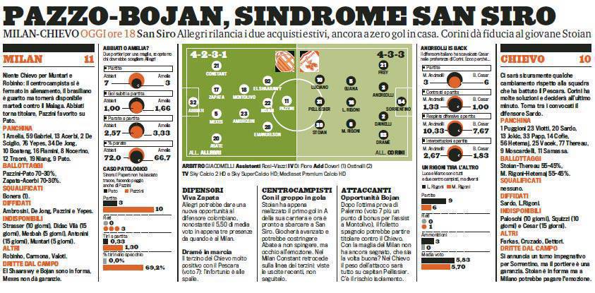 MILAN CHIEVO PROBABILI FORMAZIONI – Di seguito potete visionare le probabili formazioni di Milan-Chievo, firmate Gazzetta dello Sport. La sfida andrà in scena questa sera alle ore 18.00, anticipo dell’undicesima giornata di Serie A. Per il match di San Siro Allegri torna al 4-2-3-1 utilizzato l’ultima volta contro l’Inter in campionato. Assente Bonera per squalifica sembra favorita la coppia di centrali Mexes-Zapata. Sulle corsie Constant e Abate con Montolivo e De Jong in cabina di regia. Per l’attacco, spazio a Pazzini favorito su Pato.