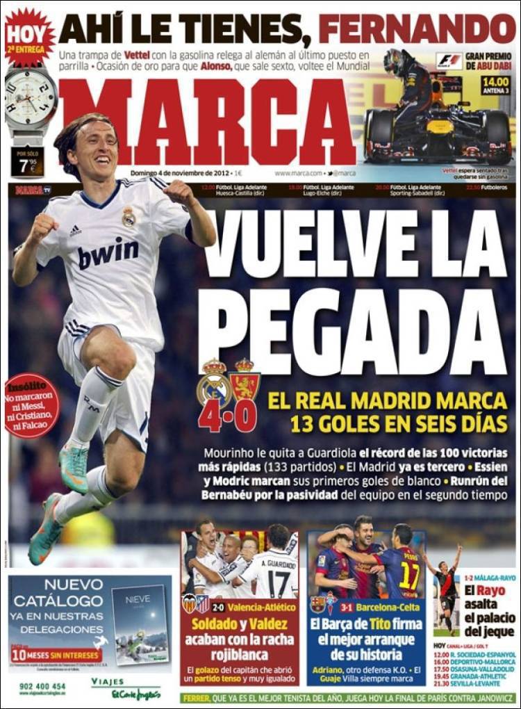 RASSEGNA STAMPA REAL MADRID SARAGOZZE – Il Real Madrid batte il Saragozza per 4-0. Unica novità della serata è che tra i marcatori non compare il nome di Cristiano Ronaldo che non approfitta del digiuno del rivale Messi. Il Real ha segnato 13 gol in sei giorni.