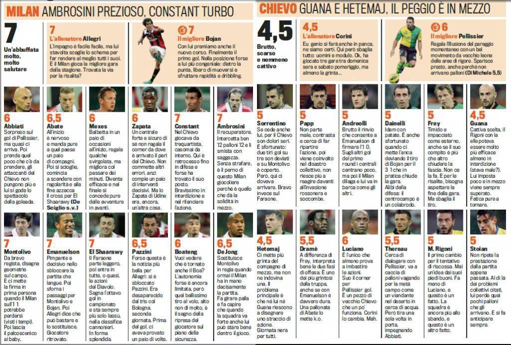 MILAN CHIEVO VOTI PAGELLE GAZZETTA – Di seguito potrete visionare i voti e le pagelle Gazzetta dello Sport di Milan-Chievo, sfida giocatasi ieri sera alle ore ore 18.00, allo stadio San Siro, valevole come anticipo dell’undicesima giornata di Serie A. La partita si è conclusa con il risultato di 5 a 1 in favore dei rossoneri, in goleada. Migliore in campo in assoluto è Bojan, ieri al primo gol con la maglia del Milan. Molto bene anche Emanuelson, Montolivo nonchè il solito El Shaarawy, all’ottavo centro ieri sera.