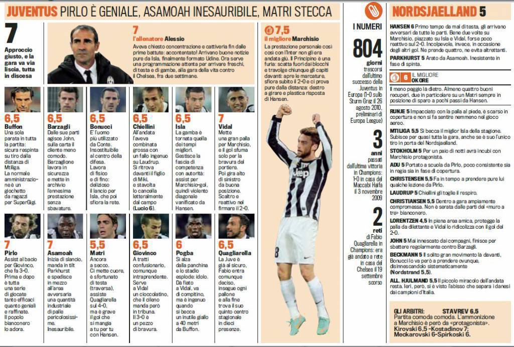 JUVENTUS NORDSJAELLAND VOTI PAGELLE GAZZETTA – Di seguito potete visionare i voti e le pagelle Gazzetta dello Sport relativi alla sfida fra la Juventus e il Nordsjaelland, gara valevole per il quarto turno dei Gironi di Champions League e conclusasi con il risultato di 4 a 0 in favore dei bianconeri. Il migliore dell’incontro in assoluto è stato Claudio Marchisio premiato dalla Rosea con un bel 7.5. Benissimo il centrocampo, con Asamoah, Pirlo e Vidal sugli scudi, ed ottima prova anche di Sebastian Giovinco.